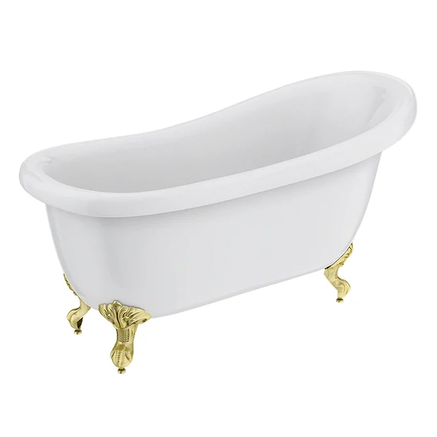 A stunning 1550mm long slipper bath with traditional brushed brass feet, enjoy the feeling of luxury with this classical free-standing bath. This elegant slipper roll top bath is the perfect centrepiece for a traditional bathroom. The bath is mounted upon traditional brushed brass feet to complete a breathtaking appearance. Made with double skinned acrylic with a superb surface finish. Slipper bath has no tap holes and a continuous rolled rim.