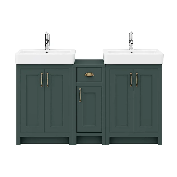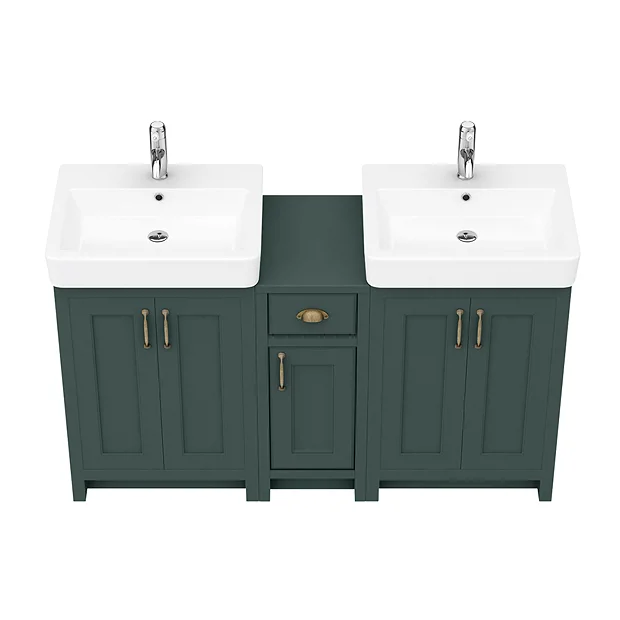Chatsworth 1420mm Traditional Green Double Basin Vanity + Cupboard Combination Unit with Brass Oxide Finish Handles