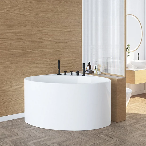 The elegant and compact Poco Corner Modern Free-Standing Bath is an excellent choice for those looking for a stylish and practical bathtub. Made from hard wearing acrylic, this bath offers a clever solution for compact bathrooms. The concealed legs are individually adjustable so you can easily level the tub on an uneven floor. With gently curved edges at both ends that provide comfortable support for your head.